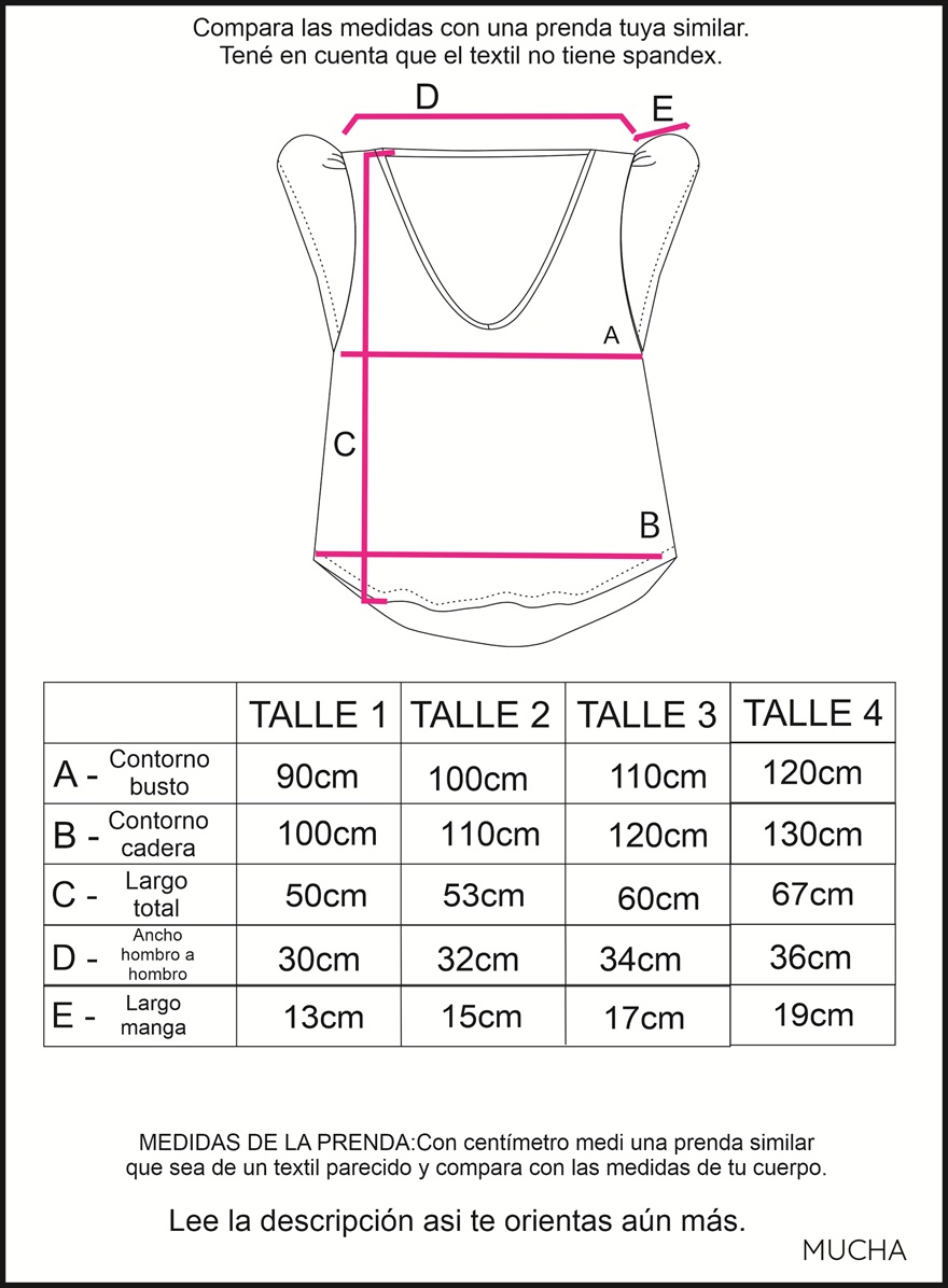 Medidas: Disponible en 4 talles, compara tus medidas con las de la tabla. Tene en cuenta que el textil encoge de largo 3 cm al lavarlo correctamente. YA ESTA CONTEMPLADO ese encogimiento en el largo que ves en la tabla. Osea que la vas a recibir 3cm más larga, hasta que la laves.