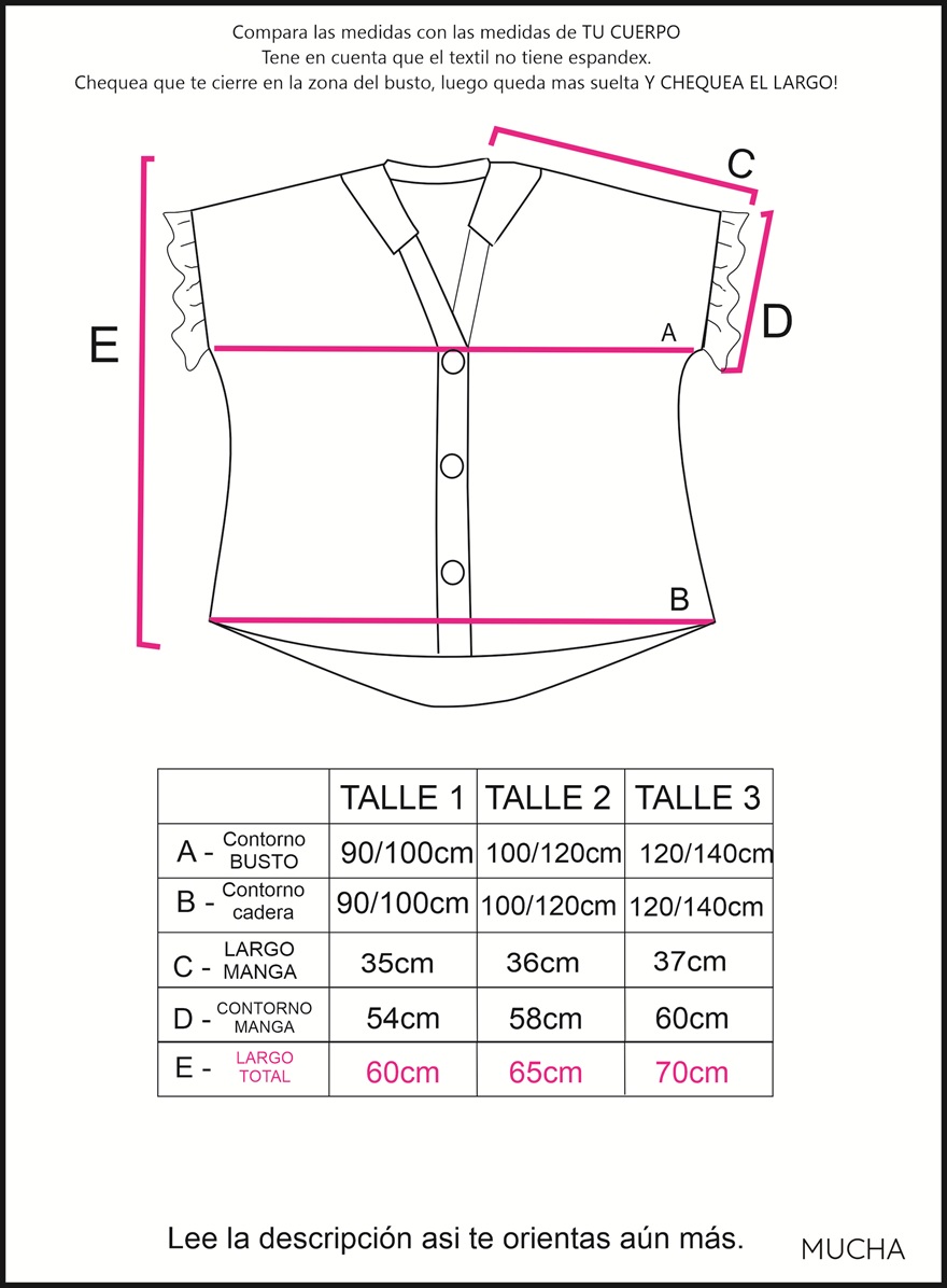 Medidas: Disponible en 3 talles AMPLIOS. Tené en cuenta EL LARGO, muchas se la llevan en un talle menos para que no les quede tan larga y muchas en un talle más para que les quede más tipo vestidito corto.