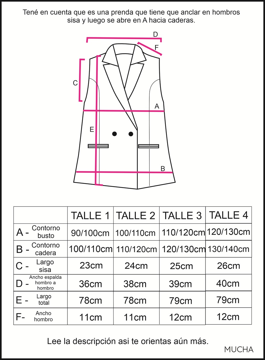 Medidas: Disponible en 4 talles, tene en cuenta la medida de hombro a hombro y la de sisa, luego cae abierto en A.