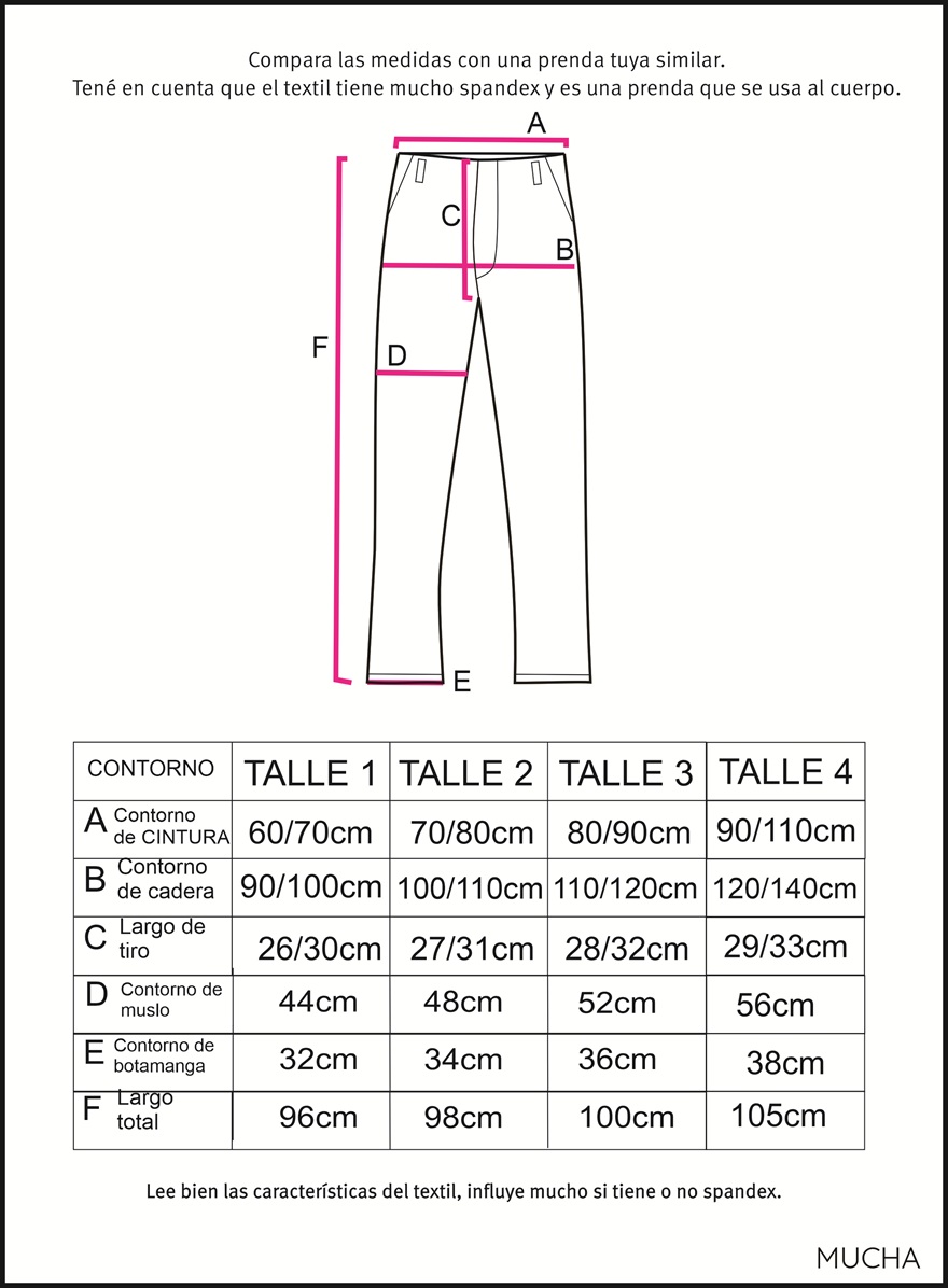 Disponible en 4 talles (lo hacemos en 4 talles xq ya lo tenemos probado así, estamos de a poco desarrollando uno o dos talles más) Pero la realidad es que como cede mucho la que es talle 5 de otros pantalones de Mucha se lo lleva en talle 4 y le calza perfecto!