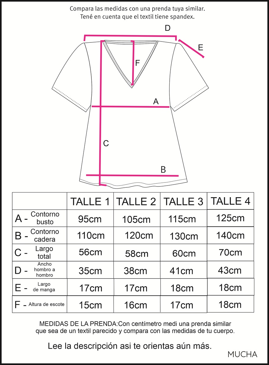 Medidas: Disponible en 4 talles, más q nada tene en cuenta el largo deseado. Al ser de algodón la realidad es que como entrarte te puede ir de un talle 1 al 4 que te va a quedar bien! Chequea medidas y pensa mas que nada como te gustaría usarla, si mas acompañando el cuerpo o bien suelta. Ambas opciones quedan súper!